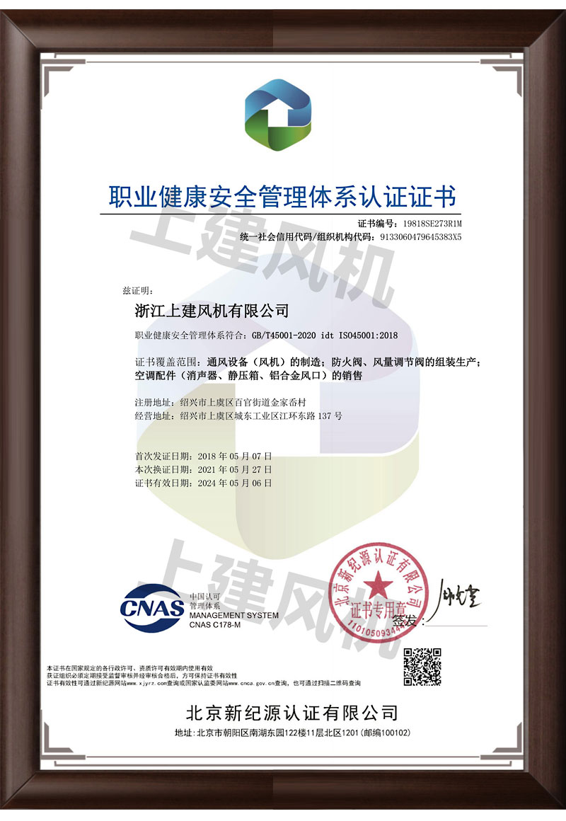 职业健康安全管理体系认证证书