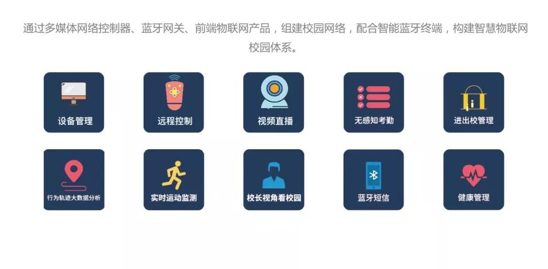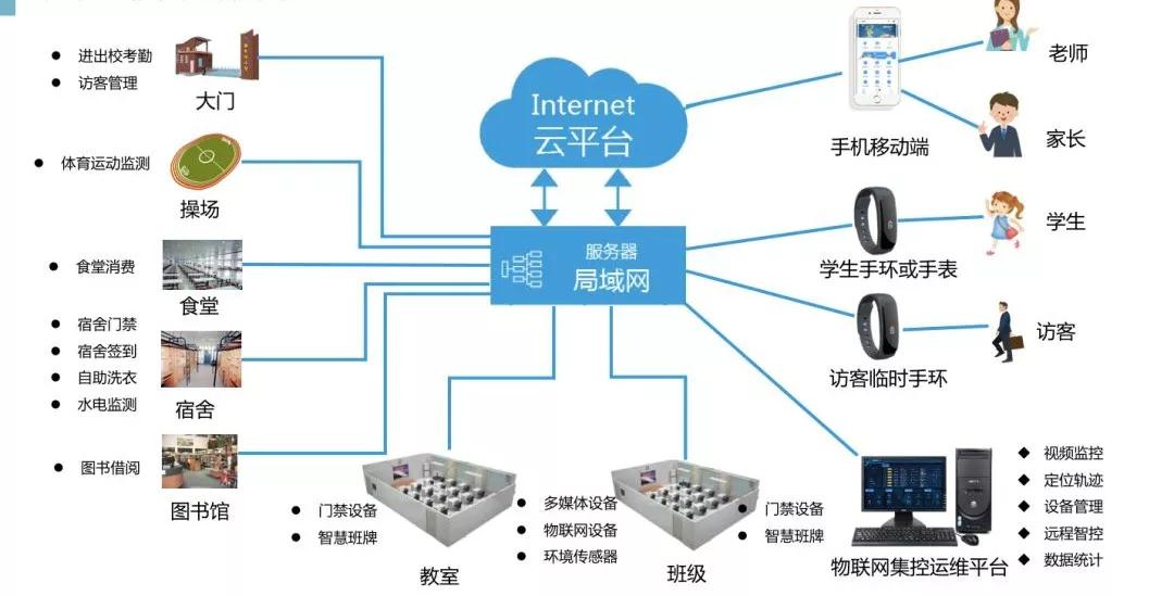 物联网智慧教室包括多媒体一体机、电脑、投影机以及电动窗帘、智能灯光、智能风扇等;学校的视频监控系统、门禁系统、广播系统、可视对讲系统、电子班牌、网络LED屏信息发布、一卡通系统等,学校所有教室以及其他区域全部能够实现集中管理网络、可视化管理,同时通过前端物联网设备进行数据采集,对采集数据进行大数据的分析展示等。