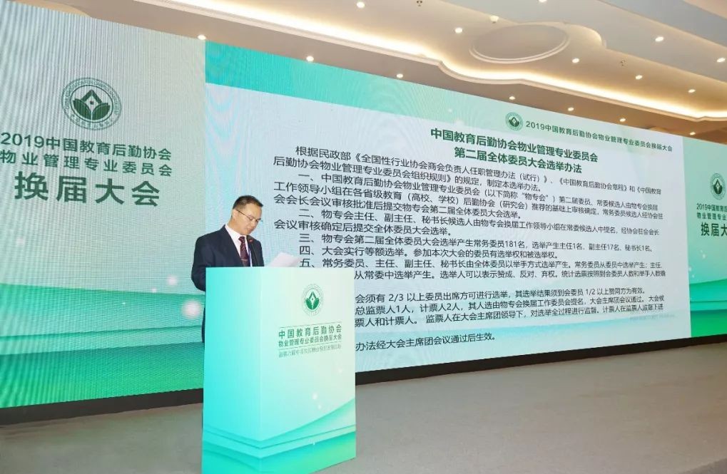物专会第一届委员会副主任、厦门大学后勤集团副总经理刘君彬宣读《中国教育后勤协会物业管理专业委员会第二届全体委员大会选举办法》。