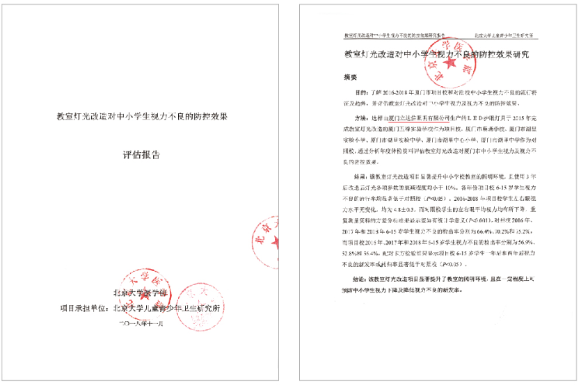 2018年,由北京大学医学部、北京大学儿童青少年卫生研究所(GB 7793《中小学校教室采光和照明卫生标准》主起草单位)发布《教室灯光改造对中小学生近视不良的防控效果》评估报告结论显示:厦门五缘实验学校改造项目显著提升了教室的照明环境,在一定程度上可预防中小学生视力下降及降低视力不良的新发率。厦门市教育局中小学生卫生保健所提供的数据显示,改造校相比未改造校视力不良率降低了5.9%-33.3%不等。
