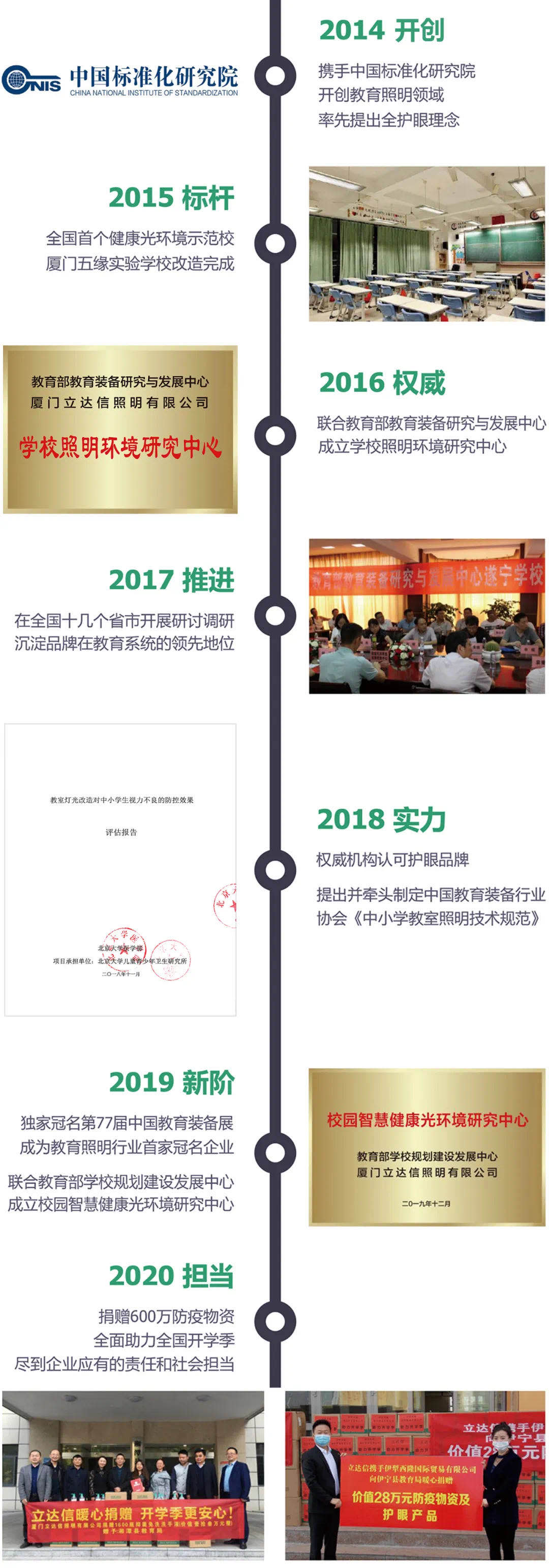 专注好光20年的立达信是教育照明领域的开创者和领跑者。秉持“用好光 保护学生视力”的初心,始发厦门,足迹遍布全国30余个省市。进入众多名校,打造健康光环境,保护学生视力健康。
