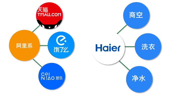 全球知名品牌阿里系中的天猫、菜鸟、饿了么等各子产业,海尔系集旗下商空、洗衣、净水等子产业集体露出,以集团知名度作为背书,提高各子产业在行业中竞争力。