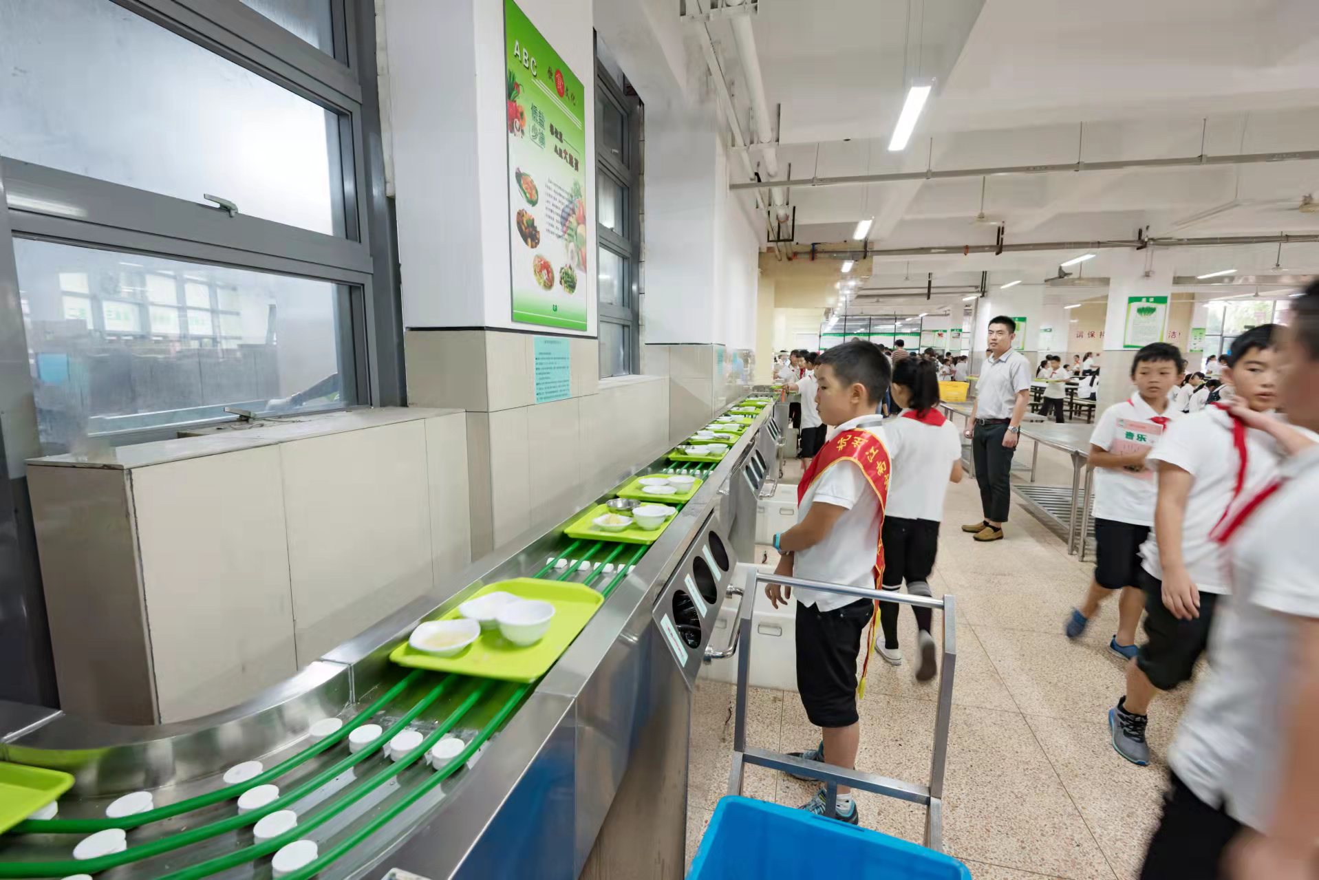 在食品入口安全最后一步,还需严格保证用餐餐具的卫生,使用全自动洗消系统,学生就餐后,可以自行将餐具放到回收流水线上,智能洗碗流水线,将自动完成收餐、除渣、清洗、烘干、消毒工序,保障卫生安全,还能节省了后厨70%洗碗用工成本。