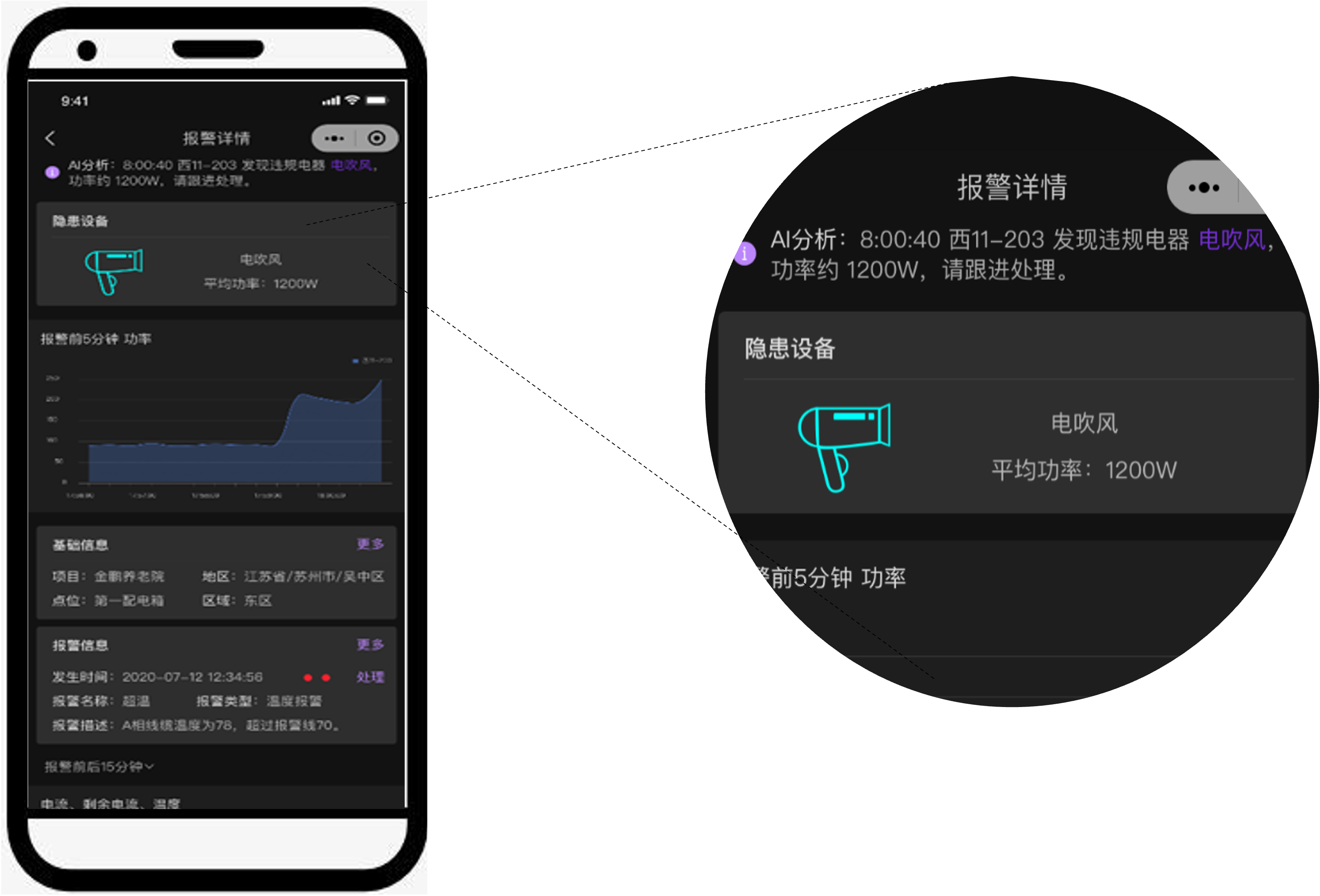 AI算法与SaaS系统:通过AI算法分析识别,发现违章电器使用行为,及其它用电安全风险。