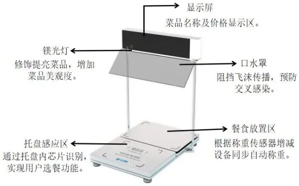托盘感应区与餐食放置区用于识别食品重量,并同步自动称重,实现智慧选餐。