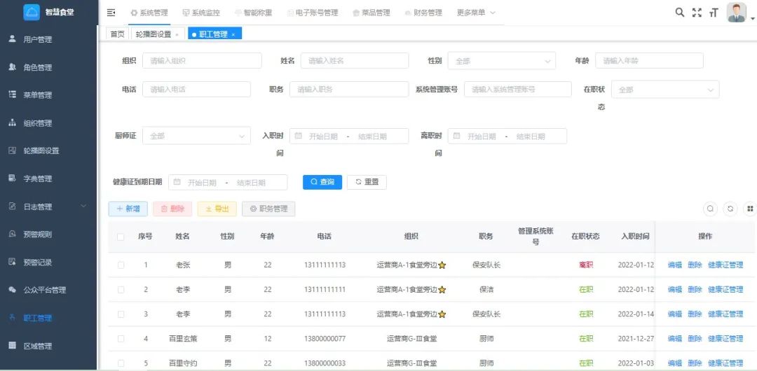支持根据组织、姓名、性别、年龄、电话、职务、系统管理账号、在职状态、厨师证快速锁定所需查询人员;