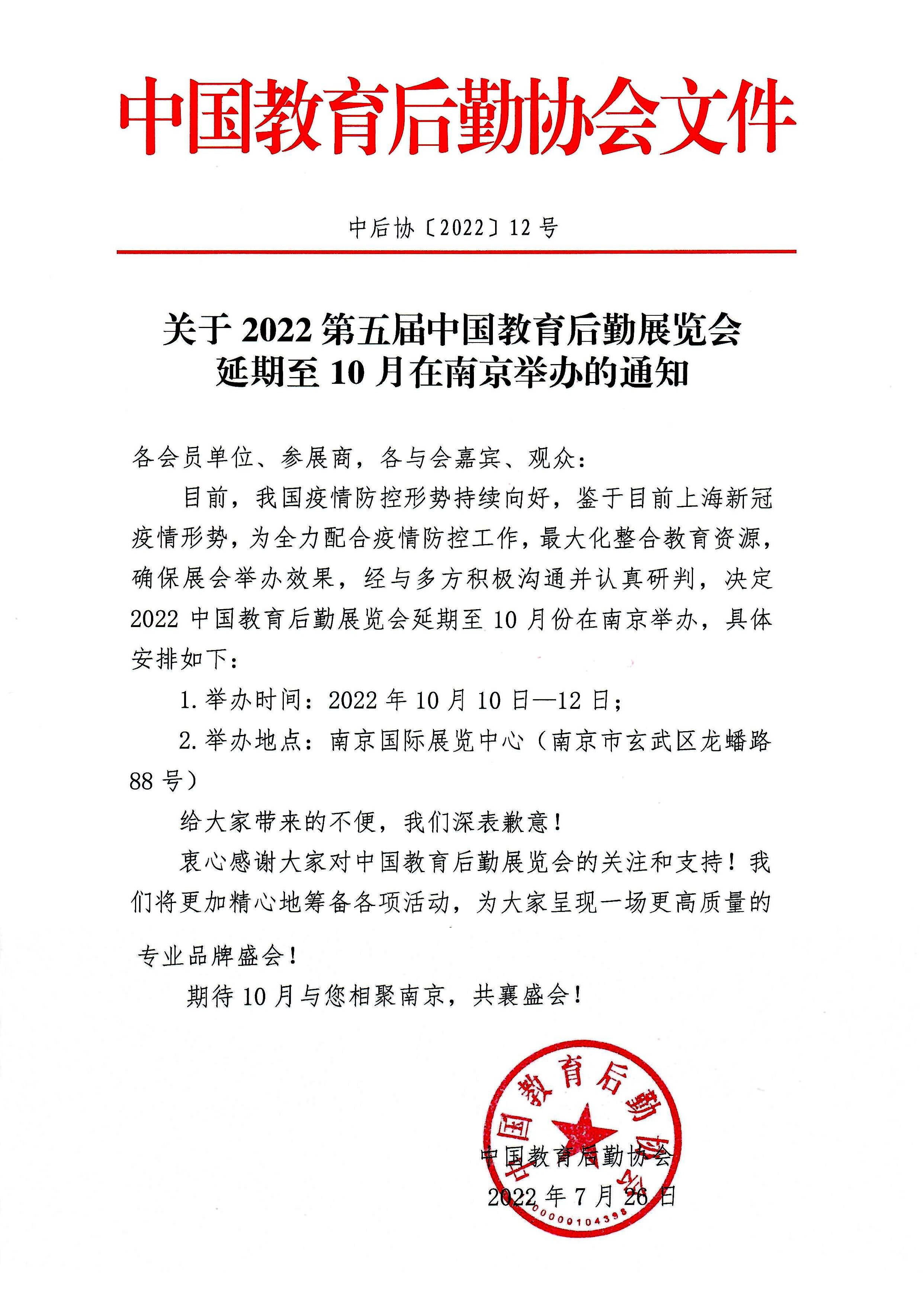 目前,我国疫情防控形势持续向好,鉴于上海新冠疫情最新形势,为全力配合疫情防控工作,最大化整合教育资源,确保展会举办效果,经与多方积极沟通并认真研判,决定2022中国广东会览会将延期至10月份在南京举办,具体安排如下: