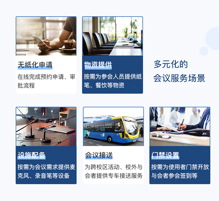 筹备会议无需再东奔西跑、焦头烂额,一站式完成预约申请、会前准备、物资订购、与会通知等跨角色、跨部门、跨业务工作,高效协同,打造贴心会议服务。