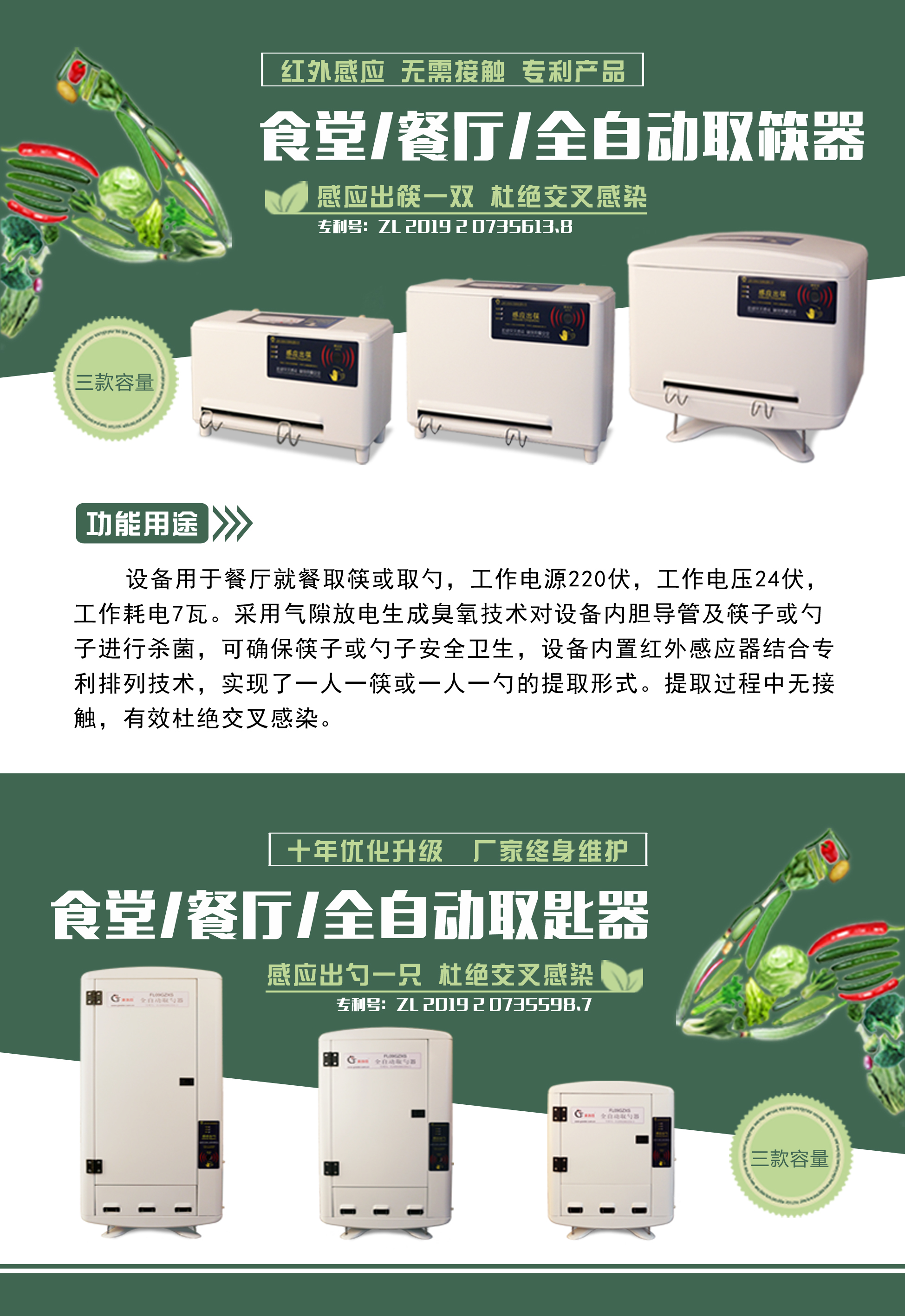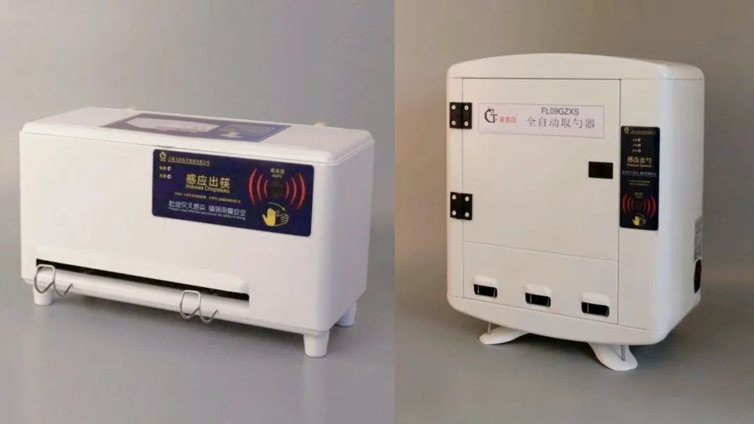 两款产品因使用场景和就餐人数的需要,设计了各3款容量机型:自动取筷器F08G-I(可放100双筷子)、F08G-II(可放200双筷子)、F08G-III(可放300双筷子);自动取匙器FL09GzxS-A(可放100只勺子)、FL09GzxS-B(可放200只勺子)、FL09GzxS-C(可放300只勺子)。