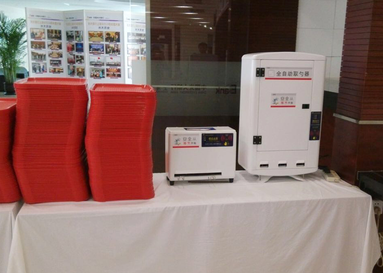 飞龙电子此次在展会将要展示的产品主要用于餐厅就餐取筷或取勺。产品工作电源220伏,工作电压24伏,工作耗电7瓦。采用气隙放电生成臭氧技术对产品内部及筷子或勺子进行杀菌,可确保筷子或勺子安全卫生,产品内置红外感应器结合专利排列技术,实现一人一筷或一人一勺的提取形式,可有效杜绝交叉感染发生。
