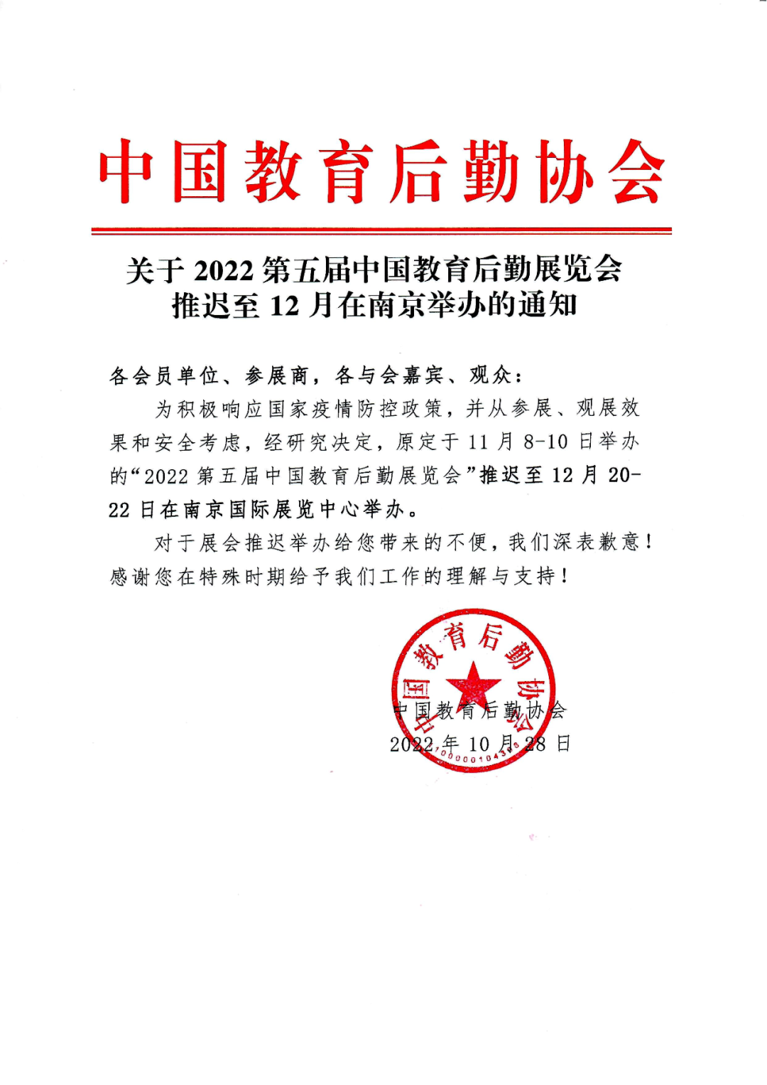 为积极响应国家疫情防控政策,并从参展、观展效果和安全考虑,经研究决定,原定于11月8-10日举办的“2022第五届中国广东会览会”推迟至12月20-22日在南京国际展览中心举办。