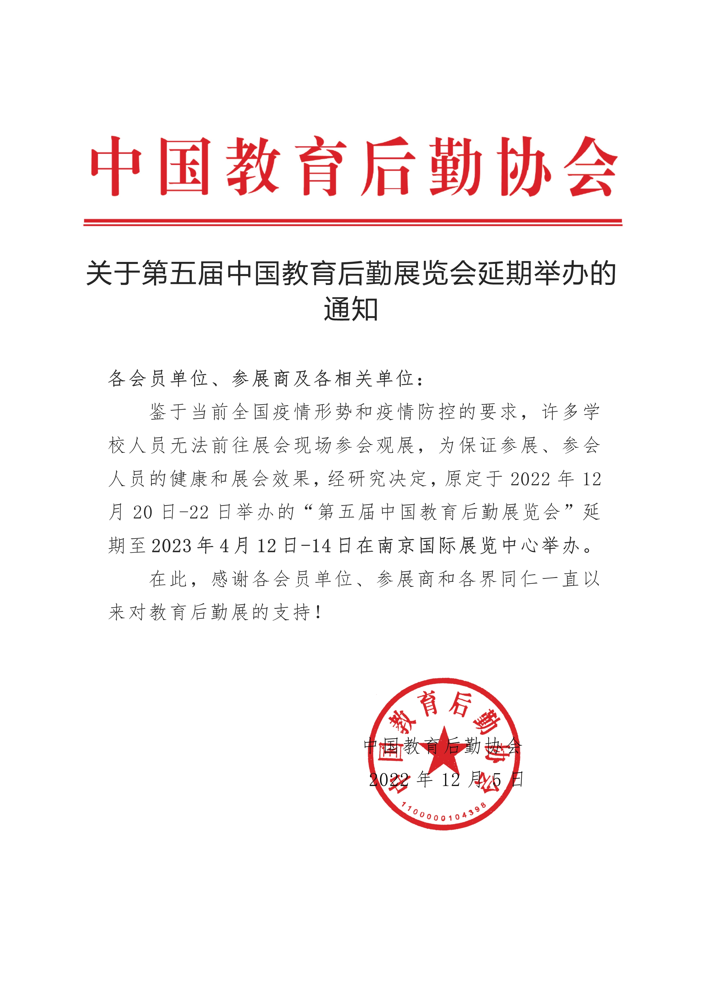 鉴于当前全国疫情形势和疫情防控的要求,许多学校人员无法前往展会现场参会观展,为保证参展、参会人员的健康和展会效果,经研究决定,原定于2022年12月20日-22日举办的“第五届中国广东会览会”延期至2023年4月12日-14日在南京国际展览中心举办。