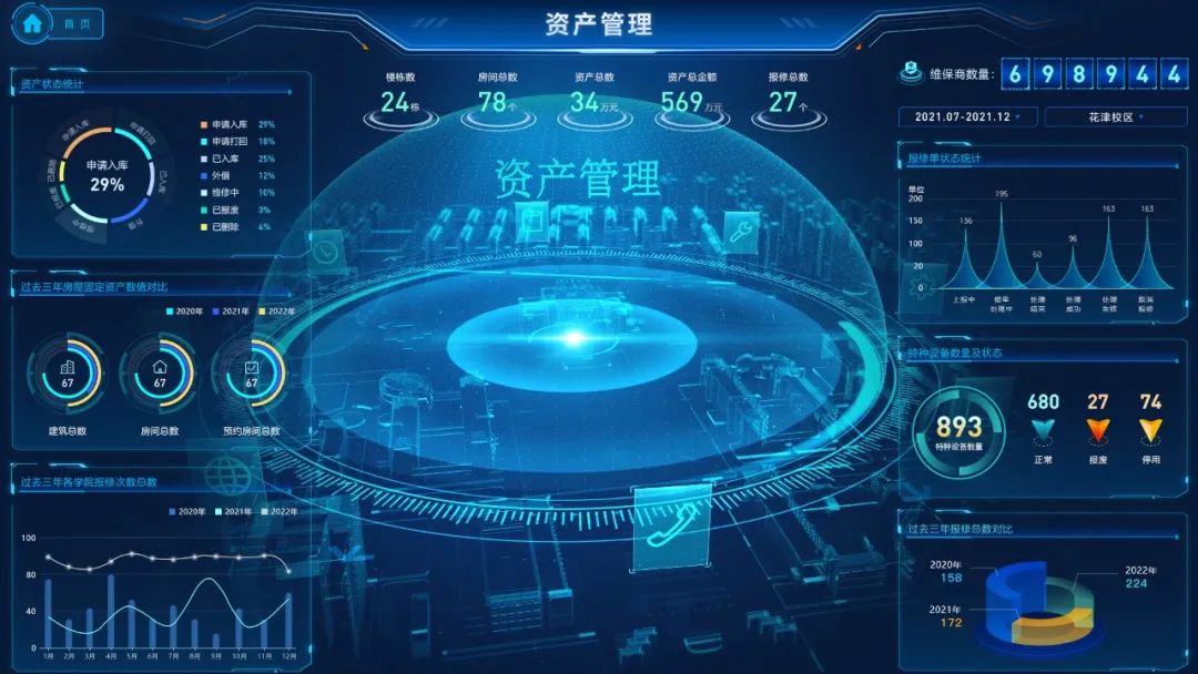 必喀秋智慧总务管理平台包含空间三维可视化、地下三维可视化、智能能源、项目管理、宿舍管理、食堂餐饮监管、资产管理、校园环境管理八大模块,全面覆盖总务所有业务实现对校园总务的智慧化管理。