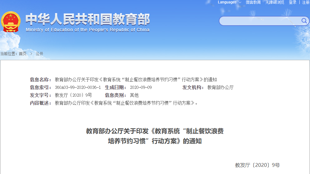 2020年教育部办公厅印发《教育系统“制止餐饮浪费培养节约习惯”行动方案的通知》。