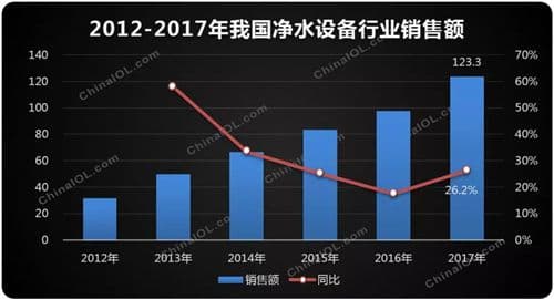 产业在线数据显示:2017年家用净水设备行业总生产量同比增长11.9%,总销量同比增长13.3%。值得关注的是,2017年销售额的增长速度要远远高于销售量,同比增幅达26.2%,产品继续向高端推进。