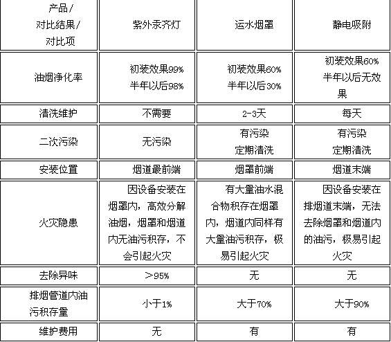 据了解目前在商业油烟机市场上常用的有运水烟罩、静电吸附、撞击流、动态离心拦截等不同油烟处理技术,在油烟净化方面有着不同的效果。以下附表是光解净化技术——紫外汞齐灯与其他油烟净化设备的对比: