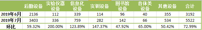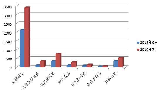 环比来看,7月份各类别招标采购信息量均有大幅的增长。暑期除后勤设备以外,其他各类别设备的需求量也有着显著的提升,也说明了暑期是学校集中采购的重要阶段。
