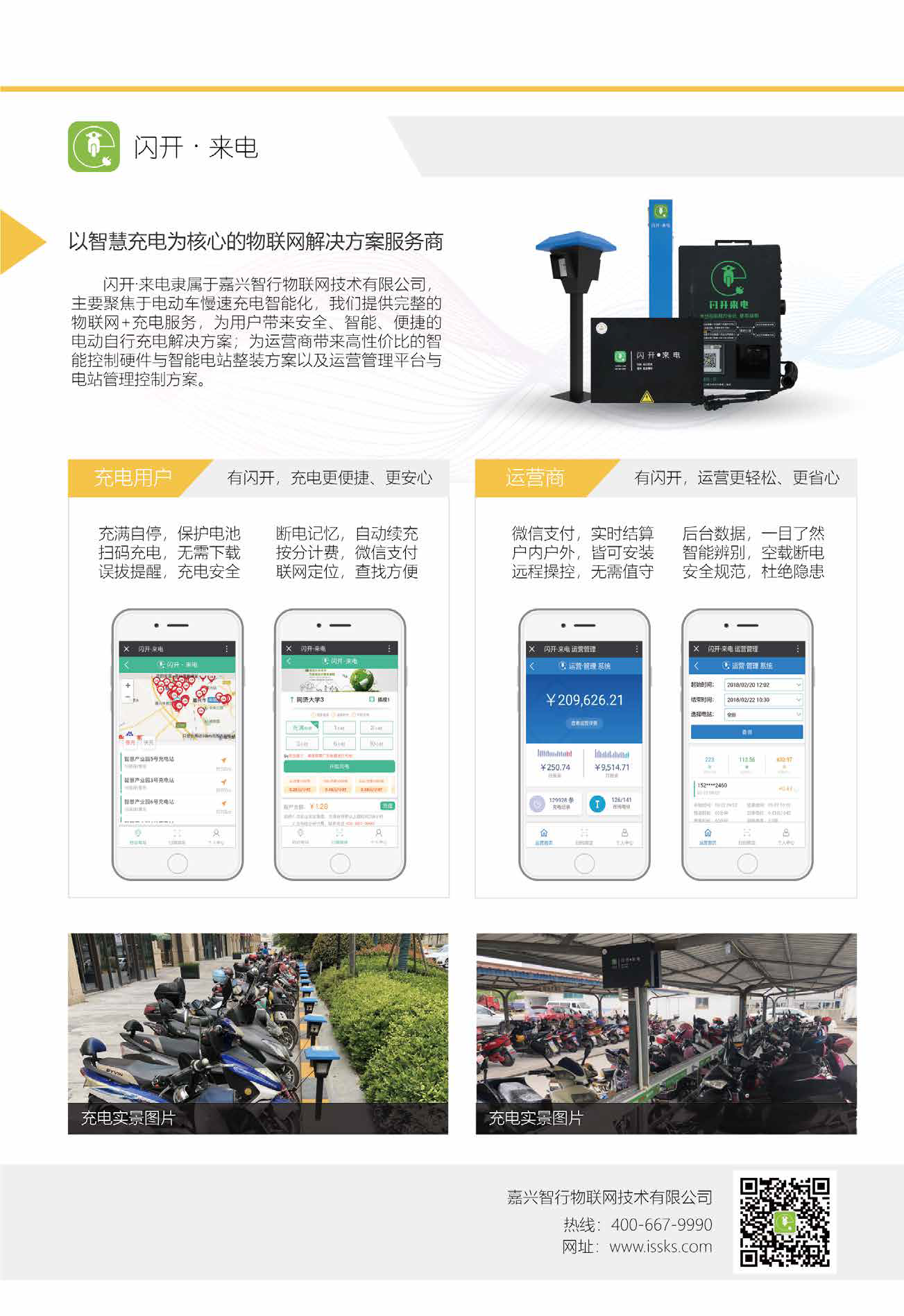秉承“安全、便捷、智慧”的产品理念,以及凭借在移动物联网技术、平台开发、硬件研发、大数据分析等方面的综合优势,智行物联提供了更为专业的低速电动车充电系统解决方案。公司旗下“闪开·来电”通过“可感知、能交互、善分析、具共享”的智能交流充电系统,为用户带来了快捷的扫码、缴费、充电及结算服务,真正意义上实现了充电桩、移动设备和人之间的智慧互联。